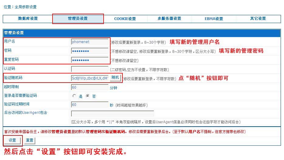 修改默認的用戶密碼、驗證隨機碼與數據庫設置