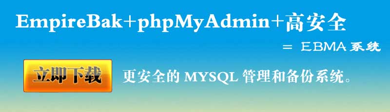| 答:“EmpireBak+phpMyAdmin+高安全”整合包就是EBMA系統、開源免費。字母取自“Empire”的E、“Bak”的B、“My”的M、“Admin”的A。 |