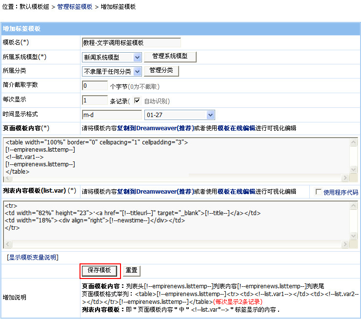 所以,萬能標簽的確定過程就是標簽模板的確定過程。 因此,要得到標簽模板ID值,就要先登陸帝國CMS后臺增加標簽模板。 |