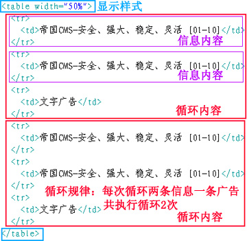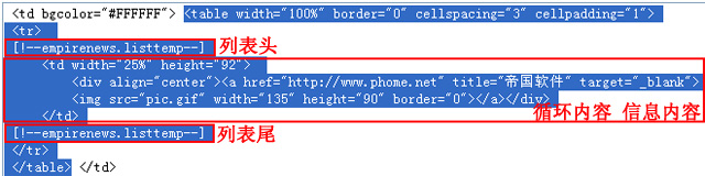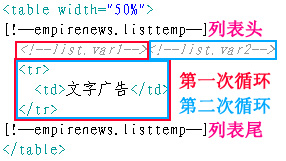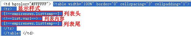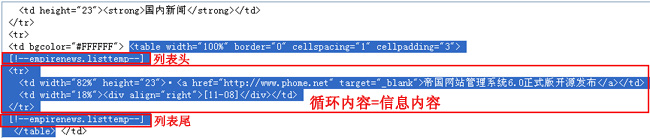 列表頭和列表尾用[!--empirenews.listtemp--]表示,是固定的,代表循環的開始和結束。