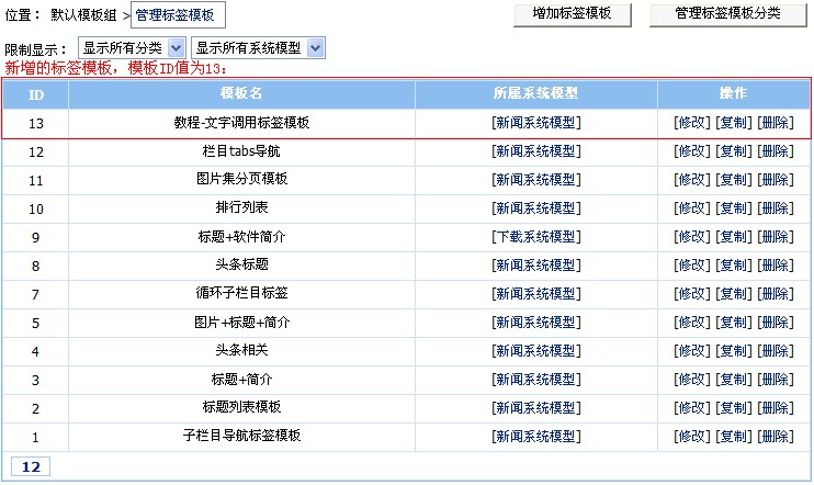 確定"標簽模板ID"值:標簽模板增加完畢后,返回"管理標簽模板"頁面,得到由CMS系統自動分配、新增加的標簽模板ID值. |