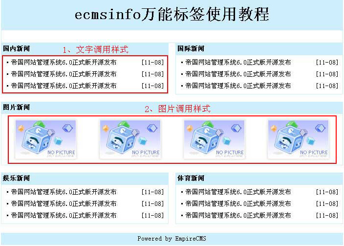 | ecmsinfo標簽與其它信息調用標簽唯一不同的是:顯示樣式由標簽模板決定。 |