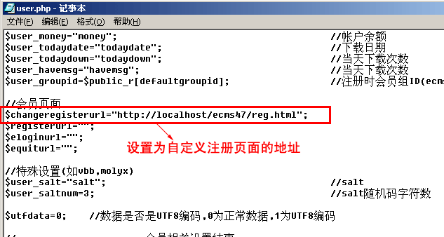 用記事本打開:e/class/user.php文件,把“$changeregisterurl”參數的值設為我們剛才自定義的注冊頁面地址,然后保存即可: