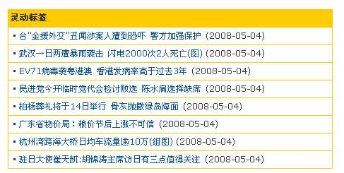 <table width="100%" border="0" cellspacing="1" cellpadding="3" bgcolor="#ffcc00" align="center"> <tr><td><b>靈動標簽</b></td></tr> [e:loop={34,8,0,0}] <tr><td bgcolor="#ffffff"> ·<a href="<?=$bqsr[titleurl]?>" target="_blank"><?=$bqr[title]?></a> (<?=format_datetime($bqr[newstime],'Y-m-d')?>) </td></tr> [/e:loop] </table> |