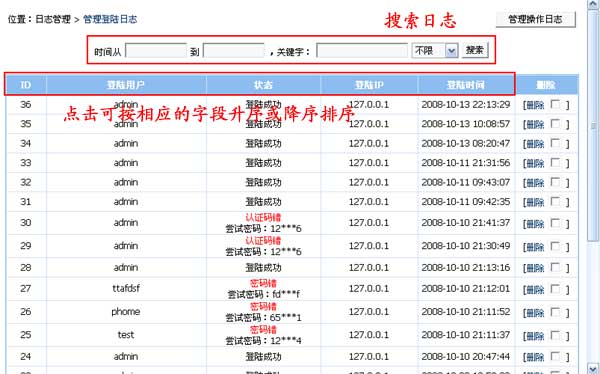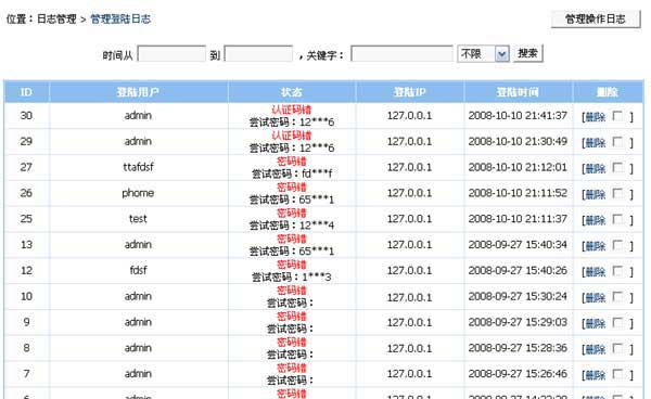 可按操作者跟操作IP進行查詢。并且可按各個字段進行排序,第一次點擊為降序再點擊為升序。如要查找最近非法登陸的記錄,點擊“狀態”進行排序,最上面顯示的就是登陸錯誤的記錄,可對非法用戶進行及時封鎖,非常方便,如圖: