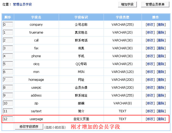 3、點擊提交后,返回管理字段頁面,可以看到我們剛增加的“userpage”字段,如下圖: