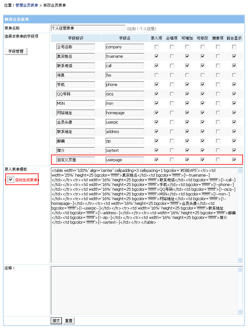 1、到“用戶面板”->“管理會員表單”->修改“個人注冊表單”,進入如下界面: