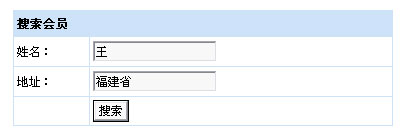 <form name="searchmemberform" method="GET" action="/e/member/list/index.php"> <table width="380" border="0" align="center" cellpadding="3" cellspacing="1" bgcolor="#CDE2F8"> <tr> <td height="25" colspan="2"><strong>搜索會員</strong></td> </tr> <tr bgcolor="#FFFFFF"> <td width="20%" height="25">姓名:</td> <td width="80%"> <input name="show[]" type="hidden" value="truename"> <input name="hh[]" type="hidden" value="LK"> <input name="keyboard[]" type="text" value="王"> </td> </tr> <tr bgcolor="#FFFFFF"> <td height="25">地址:</td> <td> <input name="show[]" type="hidden" value="address"> <input name="hh[]" type="hidden" value="LK"> <input name="keyboard[]" type="text" value="福建省"> </td> </tr> <tr bgcolor="#FFFFFF"> <td height="25"> </td> <td> <input type="submit" name="Submit" value="搜索"> <input name="groupid" type="hidden" value="1,2"> <input name="sear" type="hidden" value="1"> <input name="andor" type="hidden" value="and"> </td> </tr> </table> </form> |