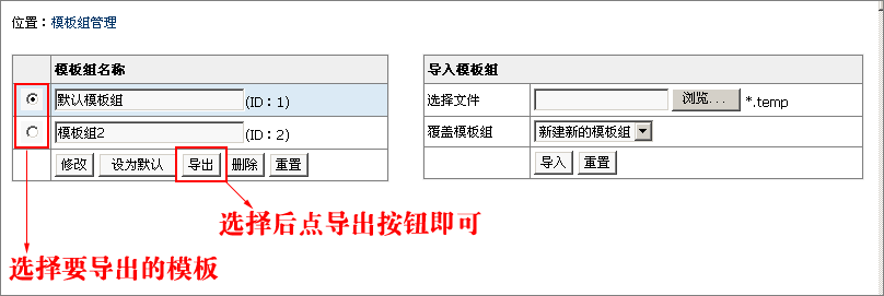 3、進入模板組管理界面,選擇要導出的模板,然后點擊導出按鈕即可。如下圖: