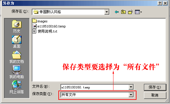 4、保存導出的模板文件,(保存類型要選擇為所有文件)。如下圖: