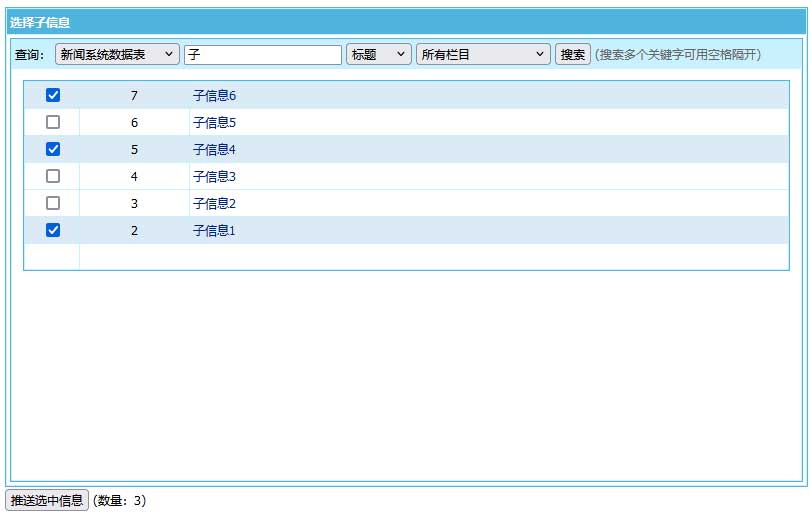 3、除了增加信息頁面可以增加子信息外,還可以在管理子信息頁面批量推送子信息到父信息里: