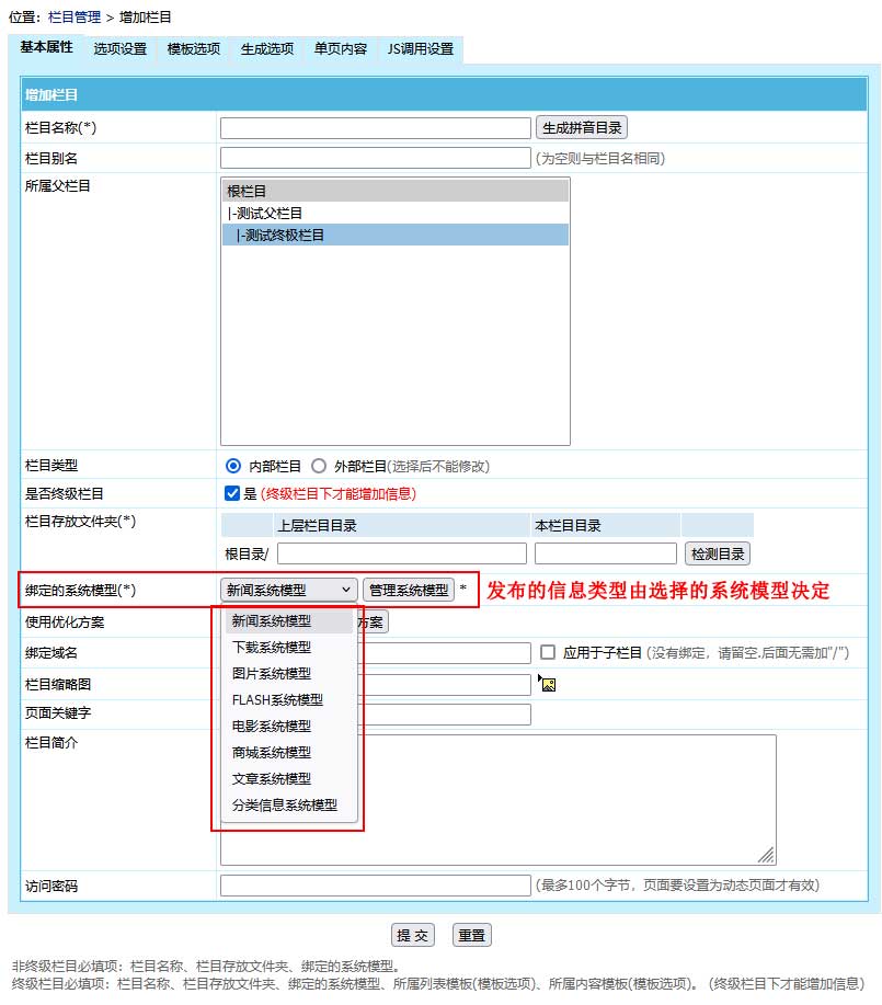 三、增加信息頁面發(fā)布的信息類型由欄目綁定的系統(tǒng)模型決定: