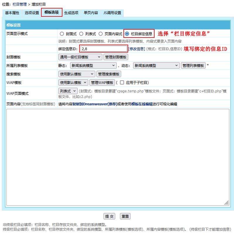 模板選項(xiàng)>“頁面顯示模式”選擇“欄目綁定信息”、“綁定信息ID”填寫信息頁面的ID,格式為“欄目ID,信息ID”。