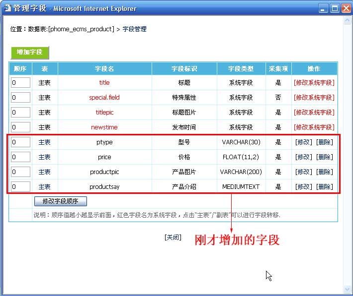 | (三)、增加字段:由于產(chǎn)品名稱與產(chǎn)品縮略圖是系統(tǒng)內(nèi)置字段,所以下面我們增加其余字段。 |
