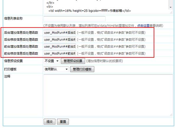 系統模型新增前臺與后臺“增加信息后處理函數”、“修改信息后處理函數”,函數格式: function user_ModFun($mid,$isadd,$isq,$classid,$id,$cs){ } 參數說明: user_ModFun:函數名 $mid:系統模型ID $isadd:值為1時是增加信息;值為0時是修改信息 $isq:值為0時是后臺處理;值為1時是前臺處理 $classid:欄目ID $id:信息ID $cs:附加參數,模型處理函數處設置的參數內容