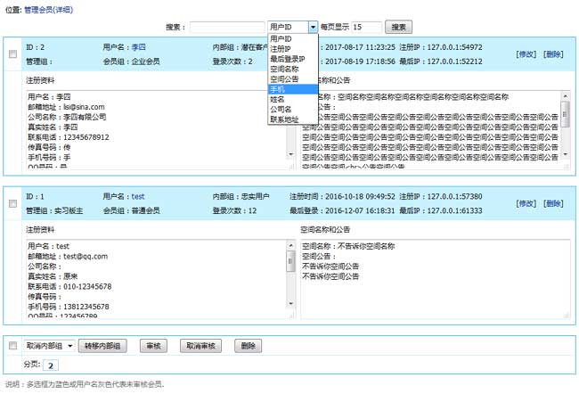 2、支持按會員副表字段進行搜索,比如按 用戶ID、注冊IP、最后登錄IP、空間名稱、空間公告、手機、姓名、公司名、聯系地址 進行搜索。
