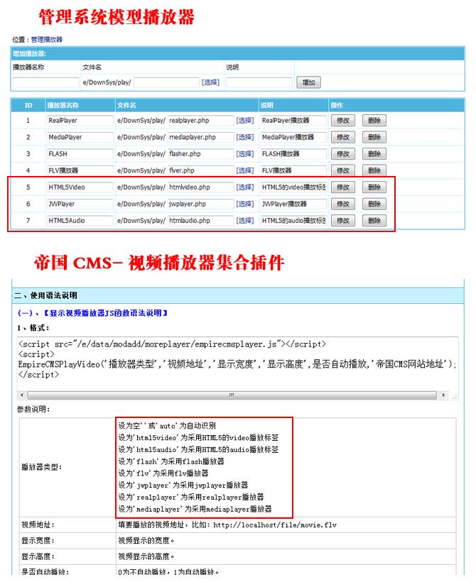 2、“帝國CMS-視頻播放器集合插件”新增HTML5的video播放標簽、HTML5的Audio播放標簽、單獨的FLV播放器支持。