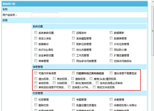 1、用戶組新增權(quán)限:可設(shè)置后臺管理員增加信息是否支持錄入html權(quán)限。