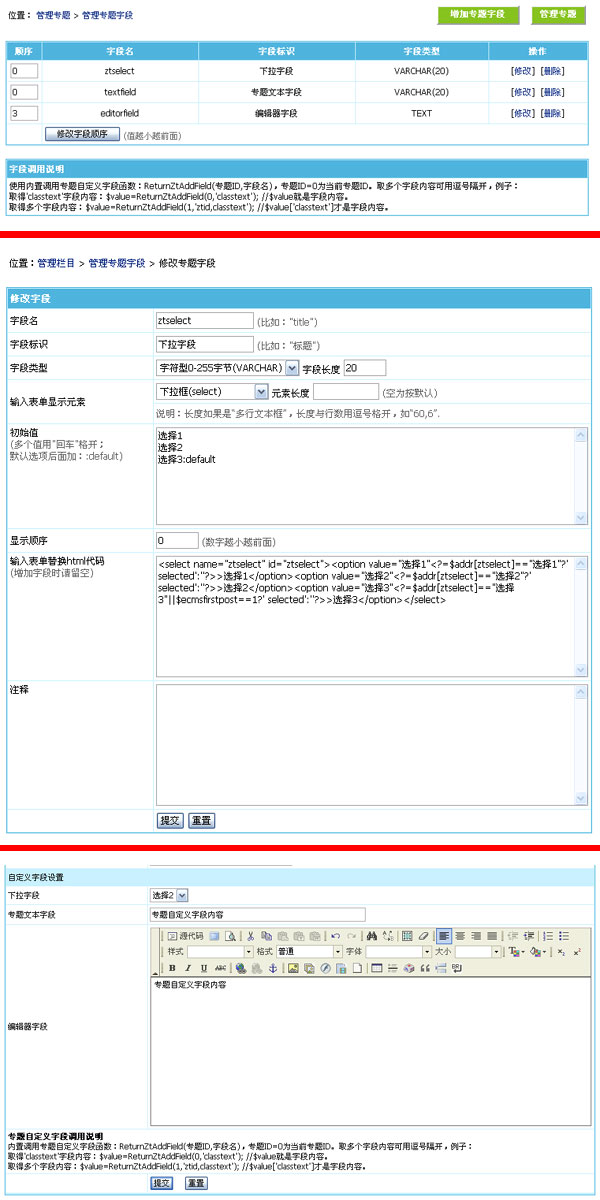 專題自定義字段功能介紹: (1)、支持自定義專題字段,字段包括支持text/textarea/編輯器/單選/多選等。 (2)、內置調用專題自定義字段函數:ReturnZtAddField(專題ID,字段名),專題ID=0為當前專題ID。取多個字段內容可用逗號隔開,例子: 取得'classtext'字段內容:$value=ReturnZtAddField(0,'classtext'); //$value就是字段內容。 取得多個字段內容:$value=ReturnZtAddField(1,'ztid,classtext'); //$value['classtext']才是字段內容。
