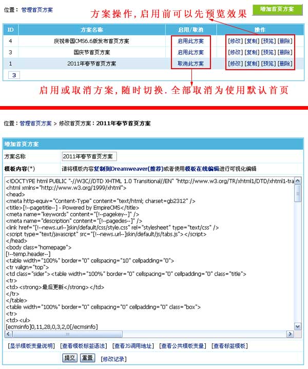 帝國CMS 6.6版新增多首頁方案功能,可以將某一方案作為臨時(shí)首頁,特別是在節(jié)假日制作特別首頁非常有用。