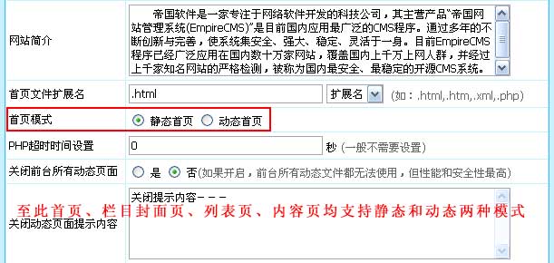 帝國CMS 6.6版首頁和欄目封面頁新增支持動態、靜態兩種模式。至此首頁、欄目封面頁、列表頁、內容頁均支持靜態和動態兩種模式。